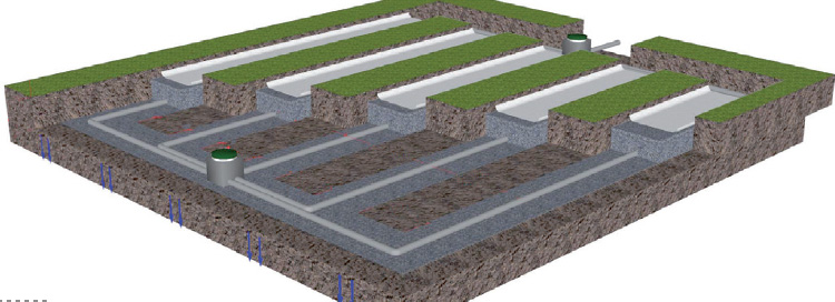 Dans une filière traditionnelle, le traitement secondaire est souvent réalisé par un filtreà sable vertical. Les eaux prétraitées s’infiltrentà travers un massif de sable et de matériaux drainants où les bactéries naturellement présentes dans le sol dégradent les polluants.